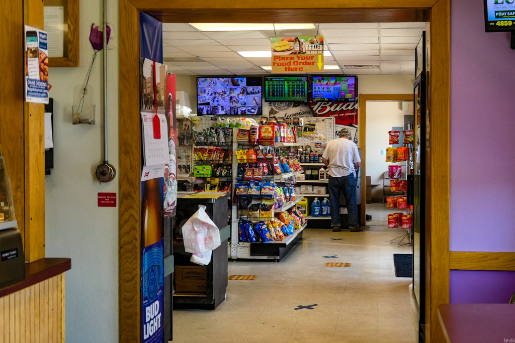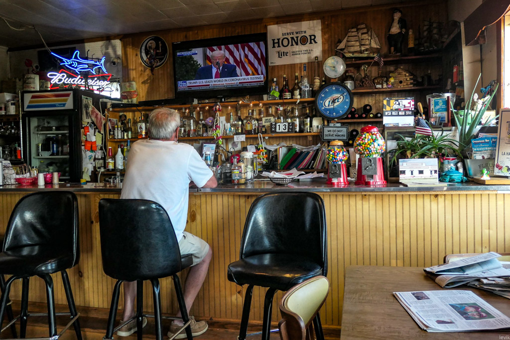 9. Внутри самая настоящая Америка: неоновая реклама пива Budweiser, и телевизор, настроенный на Fox News, который ведёт прямую трансляцию очередной речи Трампа. Мы там где-то часа два сидели (в таких заведениях не самое быстрое обслуживание), и все два часа он выступал. В этот конкретный момент президент рассказывал о том, как хорошо Америка справляется с коронавирусом.