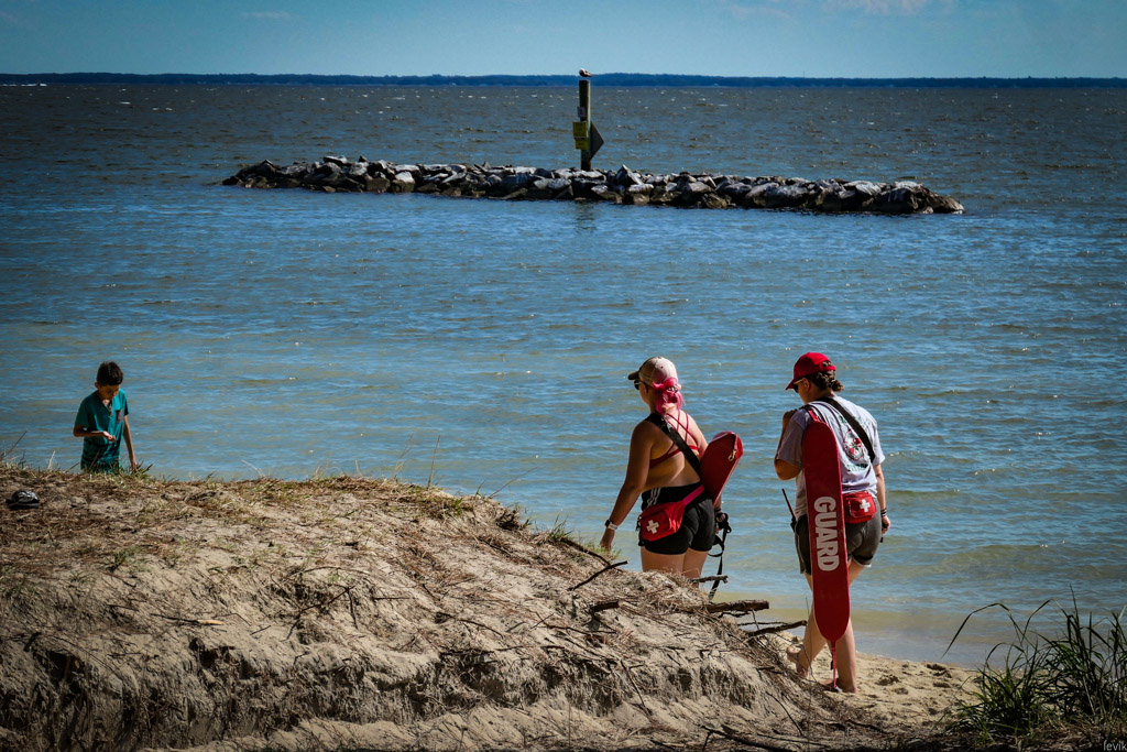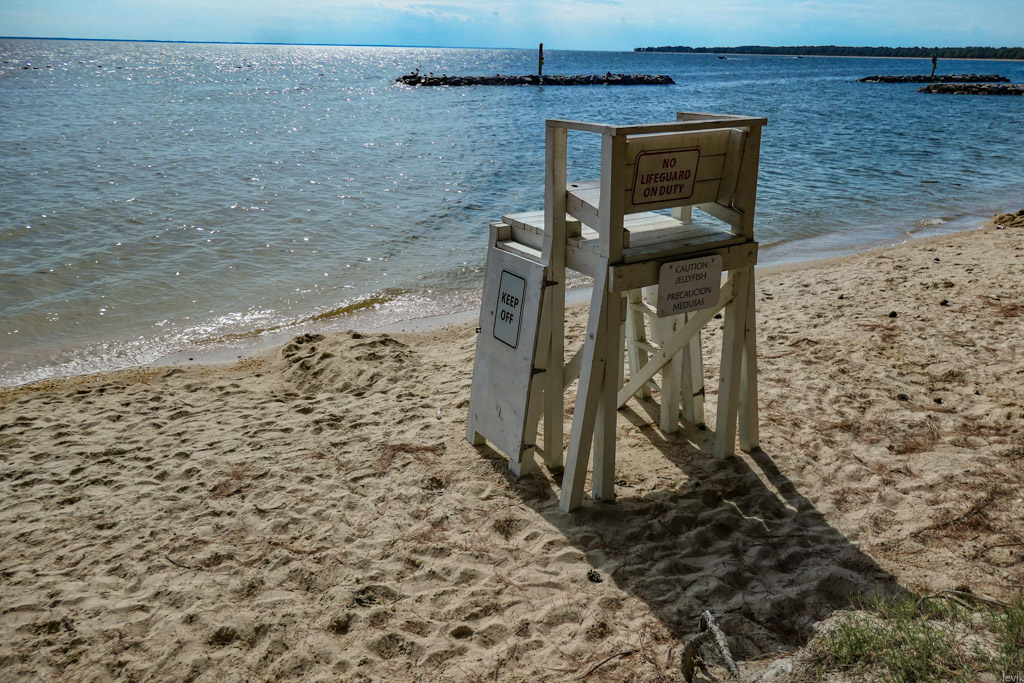 34. Я уже писал, что несмотря на близость к воде, нормально искупаться нам за неделю так и не удалось из-за большого количества медуз в воде. На спинке пляжного спасательского кресла висит предупреждение на тему них.