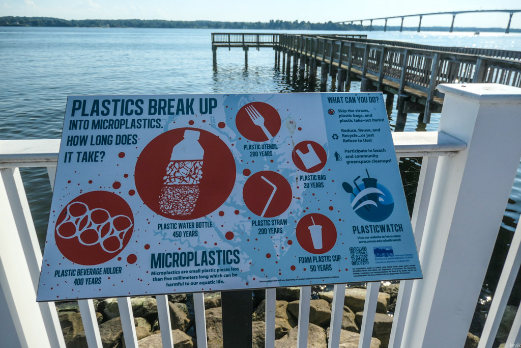 32. На поручне променада висит плакат о вреде одноразовой пластмассы: тут предлагают отказаться от ненужных пластмассовых изделий.