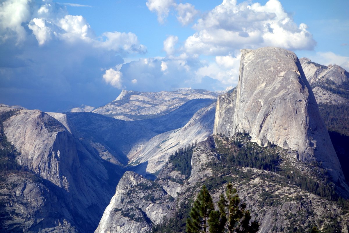 Другая знаменитая скала Йосемити - Хаф-Доум (Half-Dome, или полу-купол), как и Эль Кэп является гранитным монолитом. Со дна долины действительно выглядит, как будто у круглого каменного купола кто-то аккуратно отпилил горбушку.