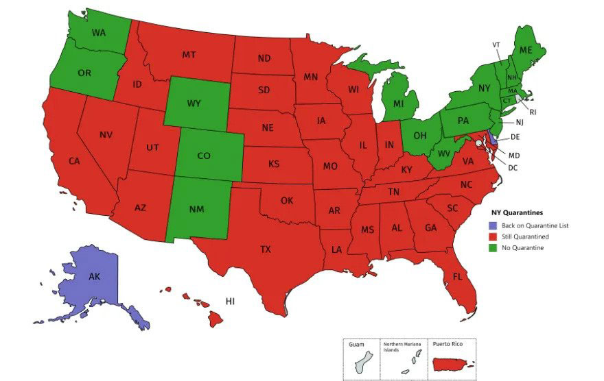 И вот, чтоб предотвратить импортированную вторую волну, ещё в июне наш губернатор издал указ о том, что все приезжие из штатов, где заболевание не под контролем, должны по прибытию в Нью Йорк отсидеть двухнедельный карантин. А чтоб не играть в любимчиков, власти установили объективные критерии того, как определять проблемные штаты: это те, где больше десяти процентов анализов дают положительный результат, или, где ежедневно заболевает больше 10 человек на каждых 100,000 жителей - 0.01% от населения. (Напомню вам, что и при подготовке к перезапуску экономики, наши власти тоже использовали похожий подход.)