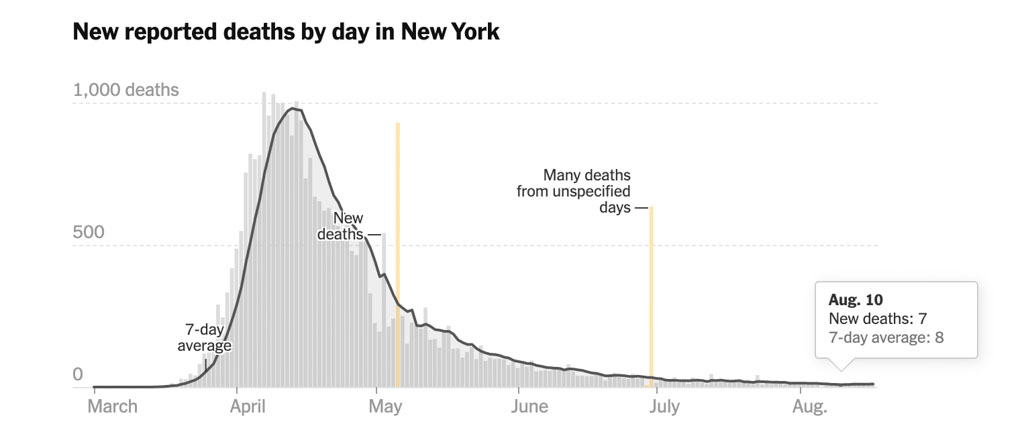 Я знаю, тут многие могут удивиться: "Как это, «из горячих точек»? А ваш Нью Йорк что, не горячая точка?" - И действительно, ведь всего несколько месяцев назад, НЙ был мировым эпицентром коронавируса. Но с тех пор ситуация значительно улучшилась. Количество больных, а главное, умирающих сильно упало после весеннего пика, и сейчас держится на очень низком уровне: