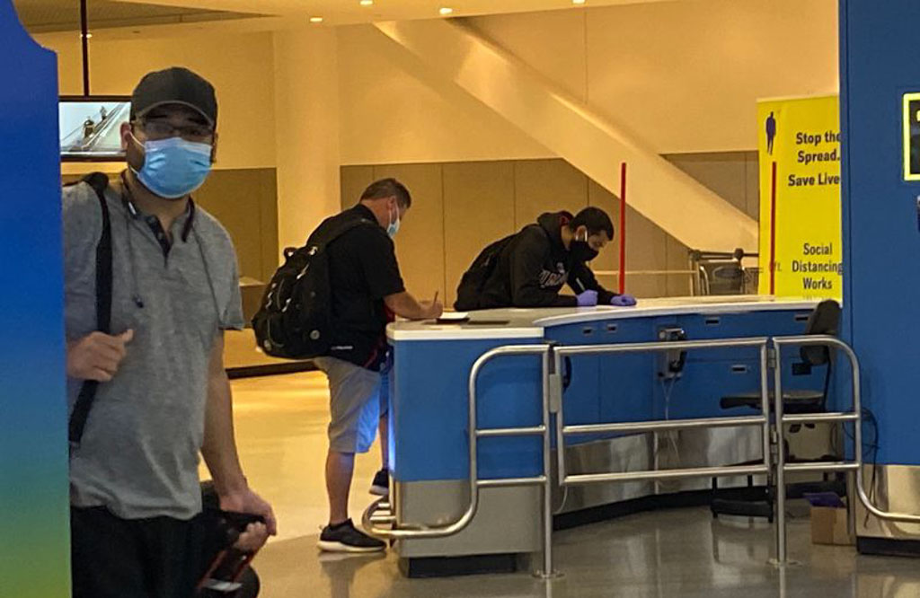 Прибывающие пассажиры брали эти листки бумаги, и разбредались по окрестности, чтоб заполнить на сподручных поверхностях. Специальных столов или ручек для этой цели предусмотрено не было. Кто-то пошёл к соседнему гейту (он пустовал), и писал, облокотившись на стойку, за которой обычно стоят сотрудники авиалиний.