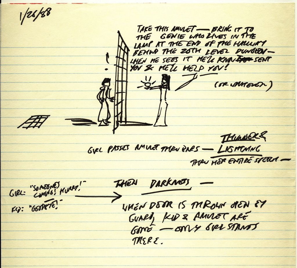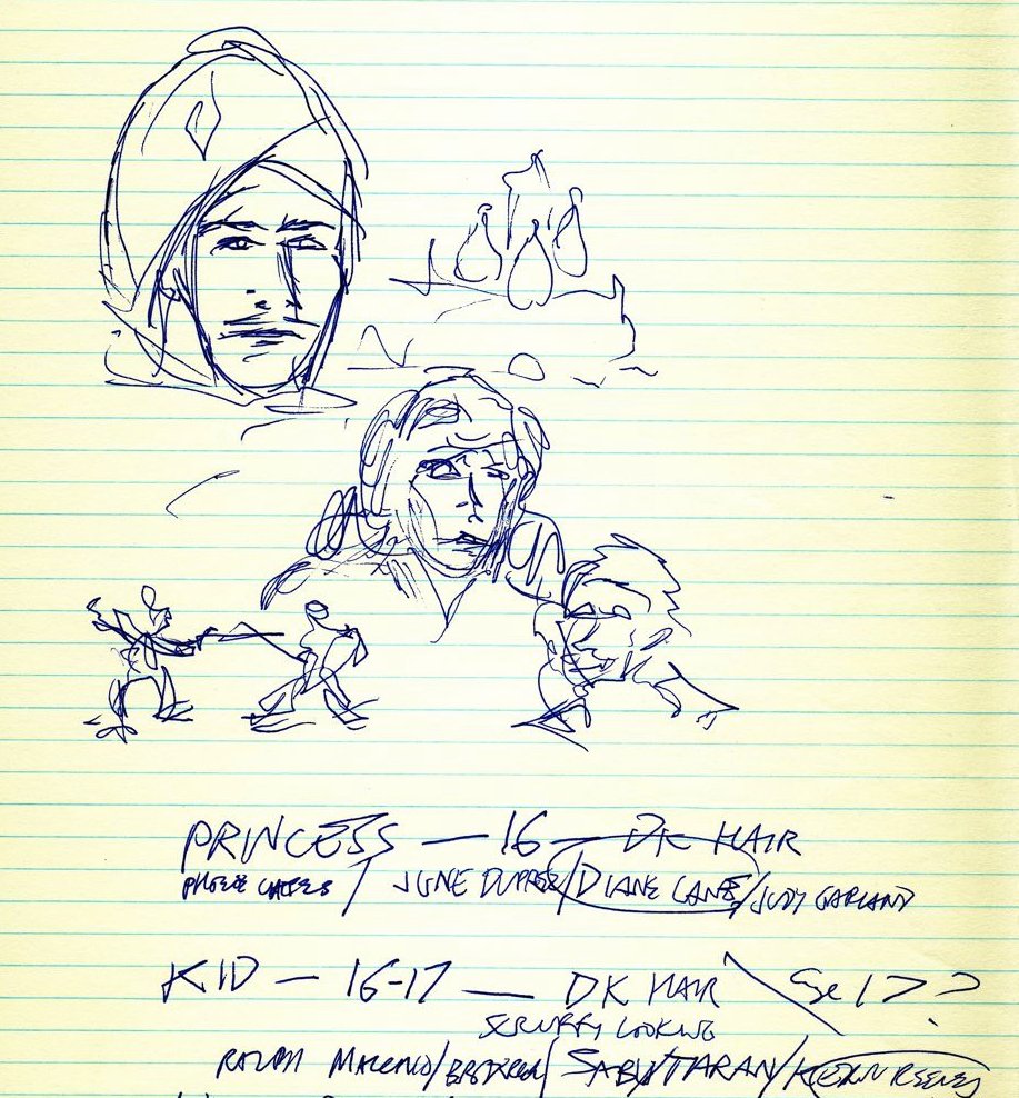 Под рисунком он выбирает типажи своих героев. В роли принцессы он видел Дайан Лейн, а принц (до сих пор, называемый пацаном) должен был быть похожим на Киану Ривза. В 1988 эти звёзды выглядели вот так: