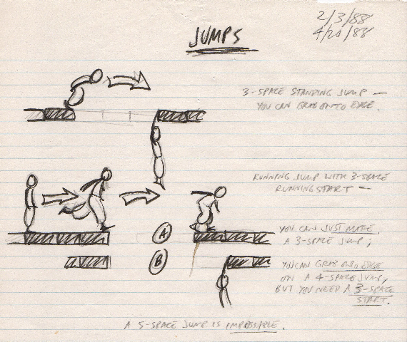 Вот одна из многих зарисовок, которые Джордан сделал во время разработки. Тут объясняется механика прыжка. Пацан может прыгнуть на 2, 3 или 4 "дольки", но никак не на 5: