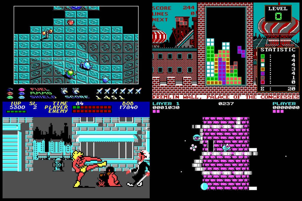 Первой, и самой ярко запомнившейся мне был "Звёздный Гусь" (на картинке - в верхнем левом углу). Играть я кстати нифига не умел - много лет спустя я был крайне удивлён, узнав, что у этой игры есть больше одного уровня. Но это не мешало мне часами сидеть за экраном компьютера, непонятно для какой цели закупленного советским государством для маминого отдела.