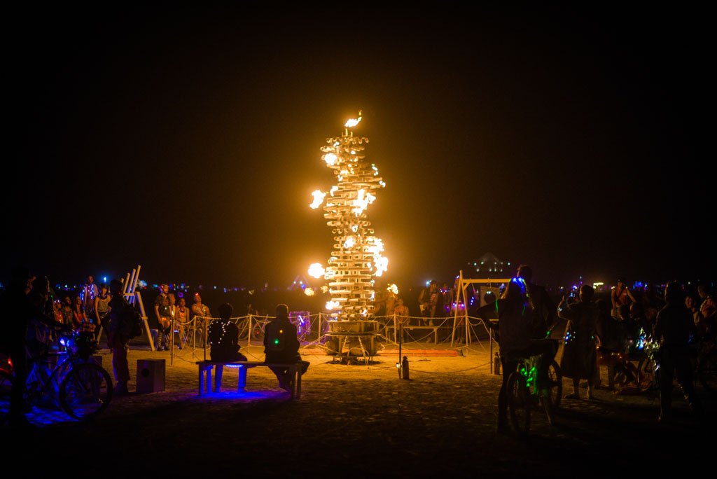 8. А потом наступает ночь, и в городе зажигают огни. Причём, обычно, когда так говорят, имеют в виду электрический свет, но на Бёрнинг Мэне до сих пор очень любят настоящее пламя. Здесь жгут дерево, разные формы другого топлива, а под конец недели сжигают и множество арт-проектов - выглядит это очень круто.
