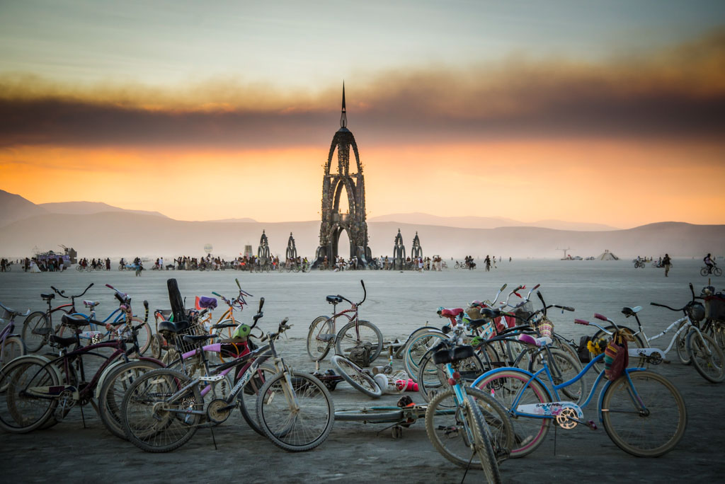7. Велосипед - главный способ передвижения. Расстояния тут такие, что пешеход тупо ничего не успеет! Вот импровизированная велопарковка на закате. Когда видишь посреди пустыни такое скопище велосипедов, значит тут что-то интересное происходит. Арт-инсталляция, вечеринка или какой-нибудь перформанс. А может это просто бесплатная наливайка.