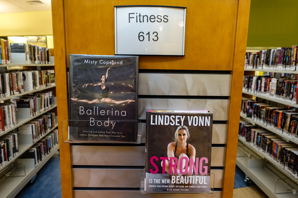 20. На торцах полок выставляют самые важные книги. В разделе "Фитнес" биографии балерины Мисти Копланд, и горнолыжницы Линдси Вонн.