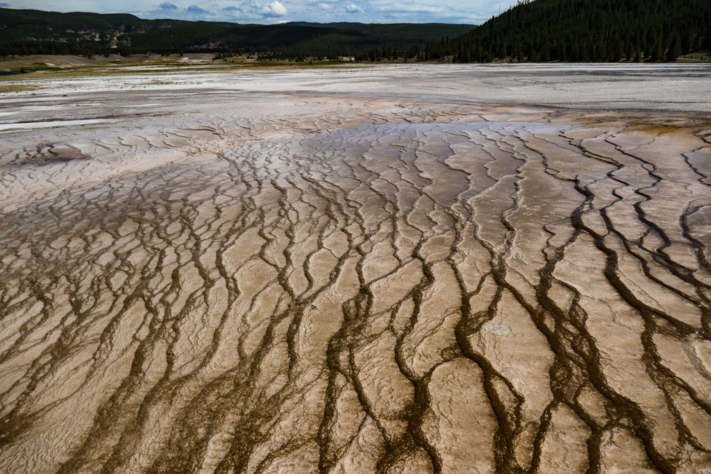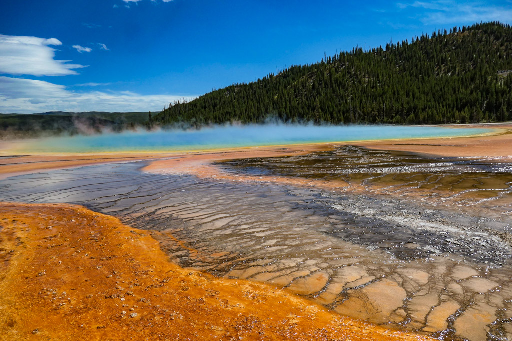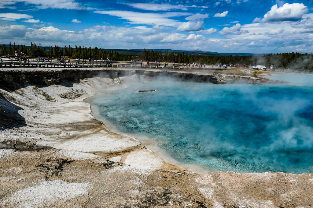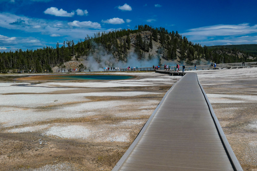 1. Это место называется Midway Geyser Basin ("Гейзерный Бассейн на Полпути"), и помимо того самого цветастого родника, там ещё много пёстрых горячих водоёмов. Ярко-голубая вода, клубы пара поднимаются - короче, очень зрелищное место.