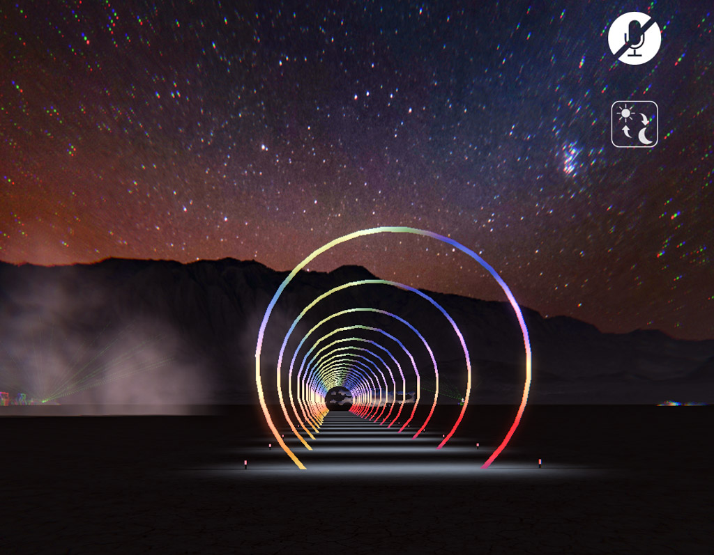 А вот трёхмерная версия интерактивного звукотуннеля, о котором я вам рассказывал несколько лет назад. Мне было приятно увидеть эту знакомую штуку в онлайн-пространстве виртуального фестиваля.