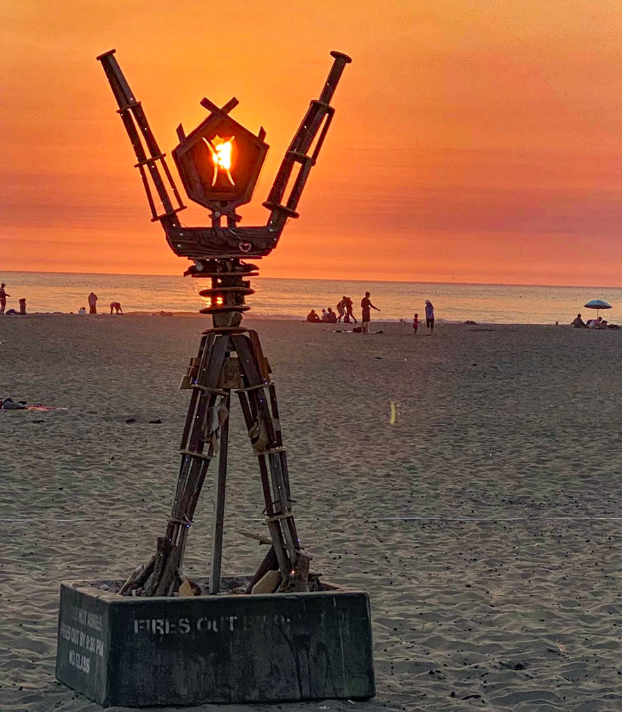 3. Но виртуальное пространство не так интересно, особенно если вы вдруг живёте в Сан-Франциско, городе, где в 1986 году "родился" фестиваль. СФ и его пригороды до сих пор остаются "столицей" бёрнеров, именно здесь проживает большинство постоянных участников, а в мастерских соседнего Окленда создаются многие самые зрелищные инсталляции, которые потом сжигают на плайе. И в этом году некоторые местные жители решили вернуться к корням фестиваля, устроив сжигание деревянной фигуры на пляже. Да, Мэн у них получился не таким грандиозным, как те, что строят в для сожжения в пустыне, но всё же это довольно неплохое подобие.