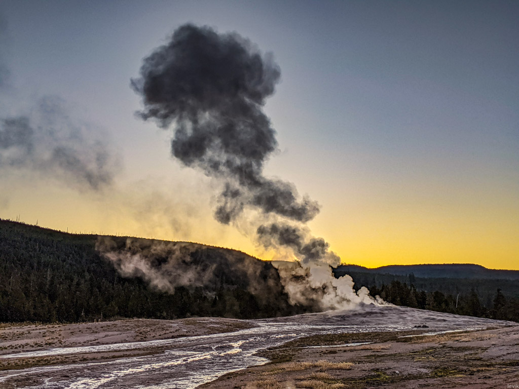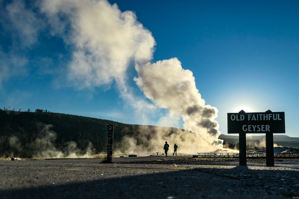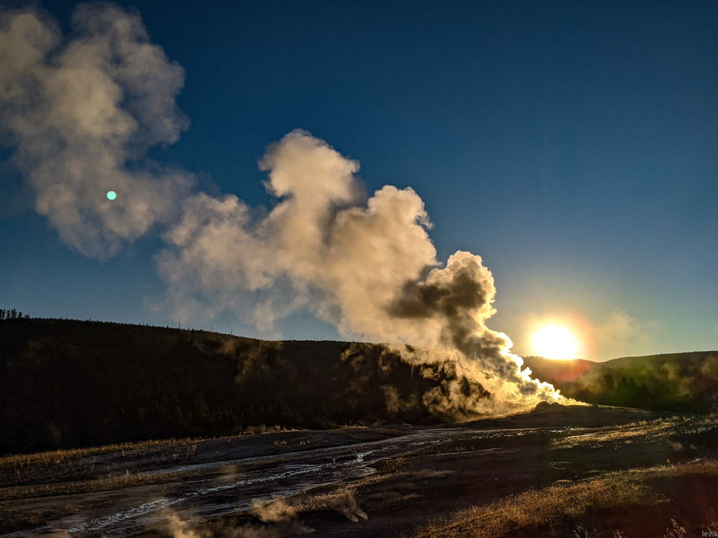 К счастью, большинство этих людей ночуют в других частях парка, и рано утром у гейзера нет практически ни души. Я вышел из номера незадолго до рассвета, и увидел, как служака грозно дымит в нежном утреннем свете. Всё это сопровождалось шипяще-пыхтящими звуками. Гейзер явно шёл на раскачку.