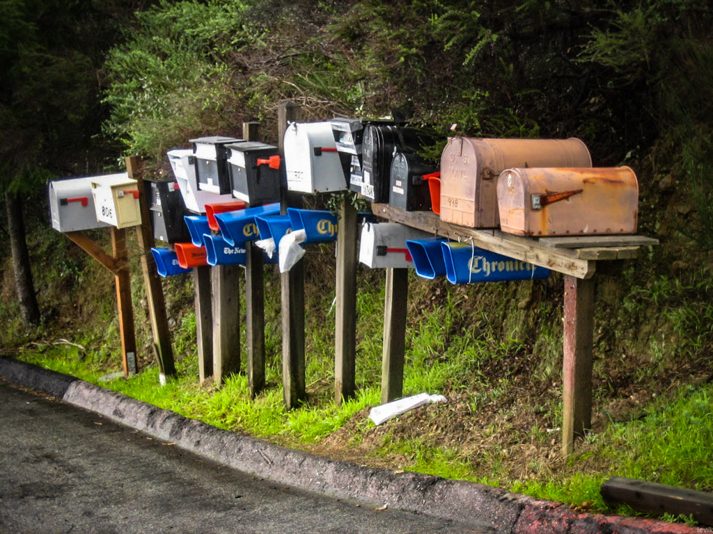 А в Америке, если уехать из многоэтажных центров городов, практически все почтовые ящики будут одинаковыми - металлические коробки с закруглённой крышей и железными флажками сбоку. Они аккуратно стоят у дороги, чтобы почтальону легче было закидывать в них почту.