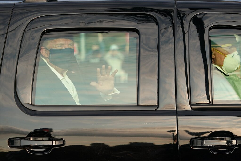 Президент не обманул: через несколько минут после выхода в его Твиттере этого ролика, он выехал к народу в своём бронированном автомобиле. Машина проехала мимо собравшихся возле госпиталя толп сторонников президента. Трамп сидел на заднем сидении в маске за стеклом, не опуская его.