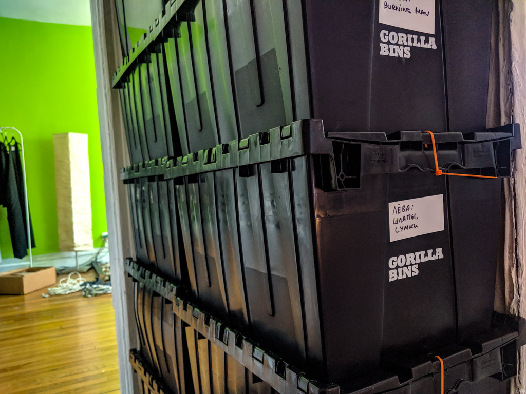 2. Где-то месяц до переезда мы активно перебирали все шкафы, выкидывали и раздавали всё ненужное. Но паковаться не начали до момента пока нам не привезли эти контейнеры. Я как раз только вернулся из очередной поездки, и на следующий день чувак доставил ящики, в которых нам предстояло перевезти свою жизнь на новое место. Началась неделя упаковочных вечеров. Тоня нашла где-то объявление человека, который отдавал целый огромный мешок упаковочной бумаги, притащила его домой, и мы постепенно заворачивали хрупкие пожитки из разных комнат, наполняли ящики, и аккуратно помечали их наклейками. Одна за другой, ячейки в моей огромной этажерке из IKEA начали пустеть.