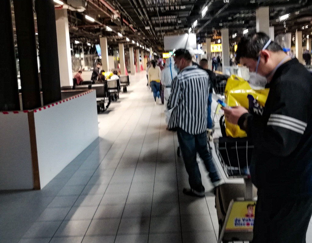 Приключения начались когда я прошел паспортный контроль в Амстердаме, т.к. следующий перелет был уже за пределы Шенгена. Мой посадочный выход на рейс в Гуанчжоу был в самом конце Терминала Е. Еще не доходя до своего гейта я оказался в толпе китайцев, что было очень непривычно после пустых пространств аэропорта. Оказывается, в этом конце терминала было одновременно аж два вылета в Китай и оба самолета были большими. Китайцы были намного серьезнее «одеты для ковида»: маски у всех были плотные, у многих еще были либо защитные очки либо прозрачные щитки на лице, многие были одеты в одноразовые защитные костюмы, бахилы и перчатки. Но при этом никто не соблюдал социальную дистанцию. Когда объявили посадку, то все выстроились в одну очередь длиной метров 200.