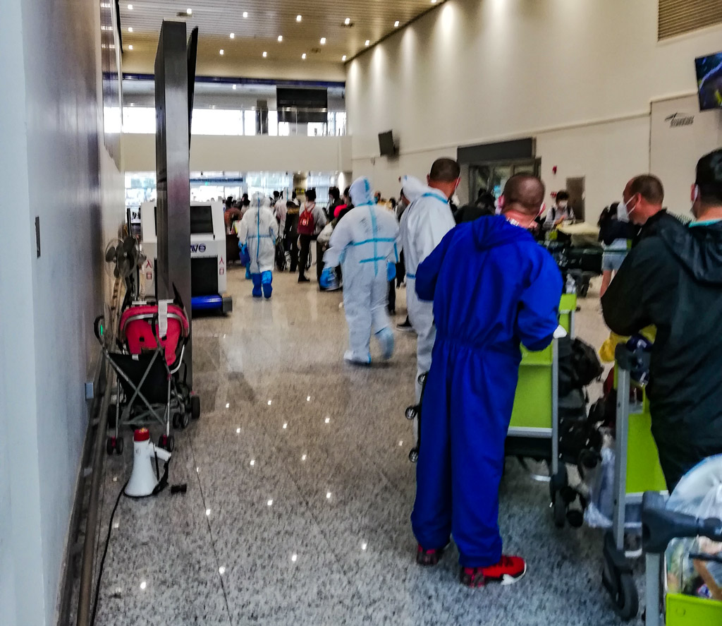 После самолета мы все оказались в огороженной части аэропорта. Там нас вызывали по номеру на бумажке, каждому еще раз измеряли температуру и помогали заполнить Декларацию о здоровье в Вичате (это главный китайский мессенджер, у него есть версия и на английском). После этого у меня в Вичате появлялся QR код который тут же сканировали, затем печатали другой QR код и наклеивали его на оборотную сторону паспорта. Далее был еще один тест на ковид. Потом был паспортный контроль и затем мы долго шли пустыми коридорами до ленты получения багажа. К тому времени весь наш багаж еще был заботливо снят с ленты и выстроен ровными рядами рядом с лентой. Потом был обязательный рентген таможенного досмотра. И наконец впереди виден выход из аэропорта, но на выход была другая очередь. Надо отметить, что весь персонал в аэропорту все также был закутан в защитные костюмы. И если в самолете было прохладно, то в аэропорту, ближе к выходу было жарко, а в защитных костюмах ведь еще жарче!