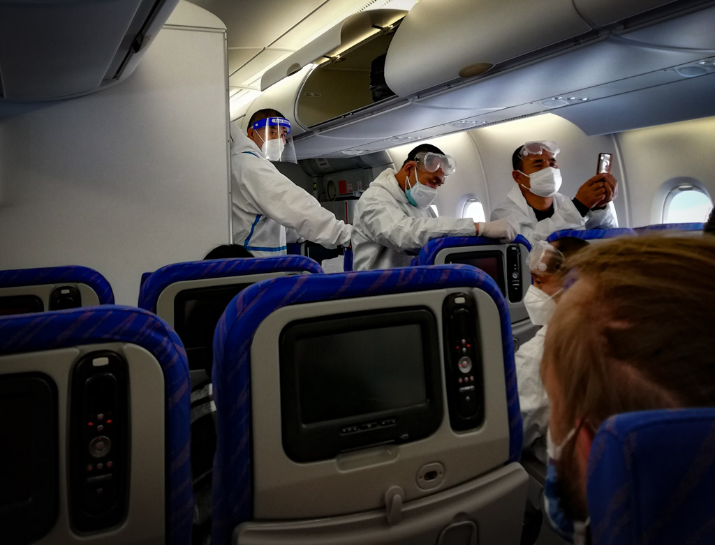 В самолете оказалось, что весь борт персонал одет не менее серьезно, тоже защитные костюмы-маски-очки-перчатки-бахилы. Чтобы хоть как-то отличаться от пассажиров у каждого из персонала было что-то крупно написано маркером по защитному костюму на спине. Я думаю, это просто их имена.
