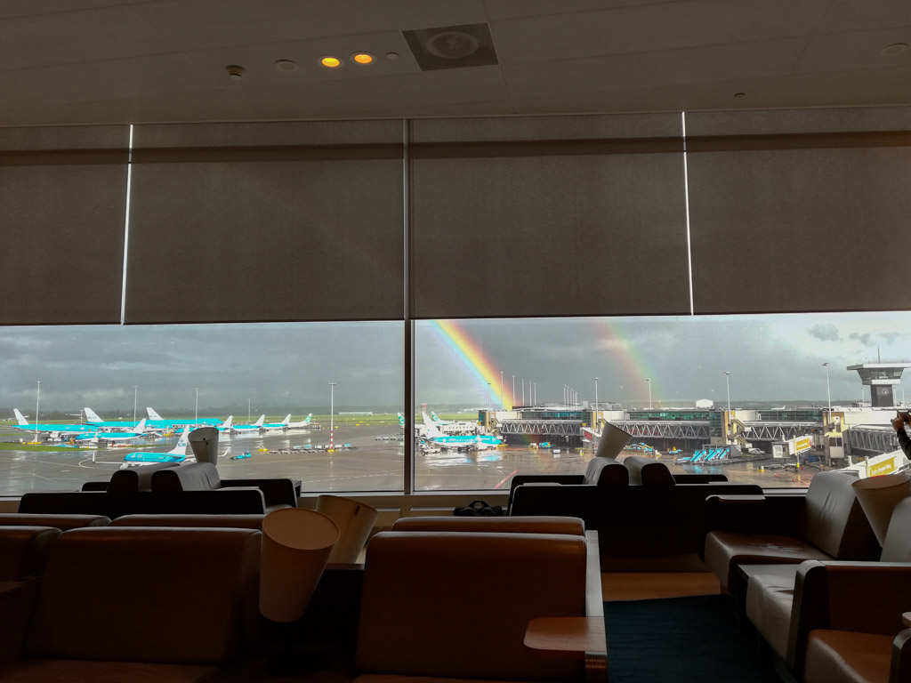 Хоть людей было мало, почти все магазины и кафе в аэропорту работали. До Амстердама я долетел быстро и без приключений. Амстердам встретил меня яркой радугой через все взлетное поле. Аэропорт был также пуст как и в Брюсселе.