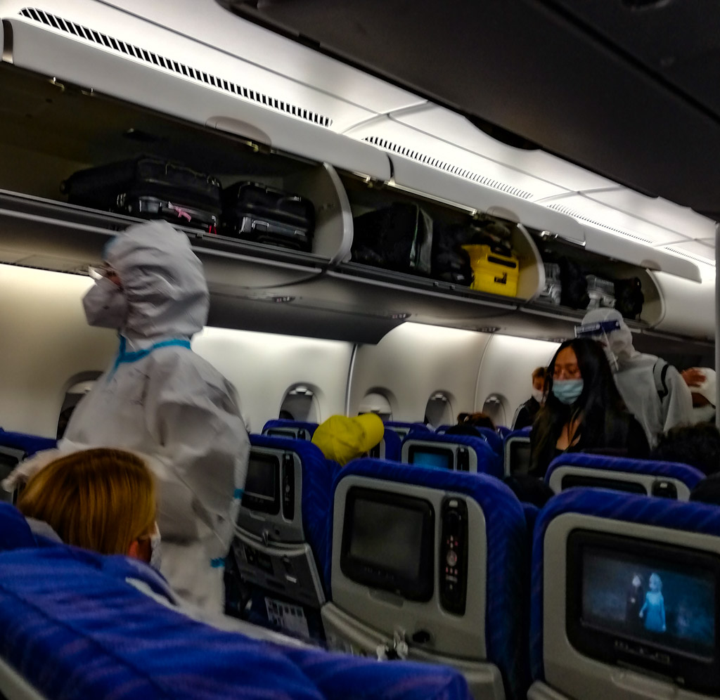 Когда мы приземлились в Гуанчжоу и самолет подкатил к терминалу, то нам объявили что вставать нельзя. Посадочные рукава нам не сразу подсоединили. Вместо этого проводники открыли люки, натянули поперек ленточки что проход закрыт и проветривали наш самолет минут 40. Только после этого подсоединили рукав и стали нас выпускать ряд за рядом. На выходе каждому давали бумажку с номером.