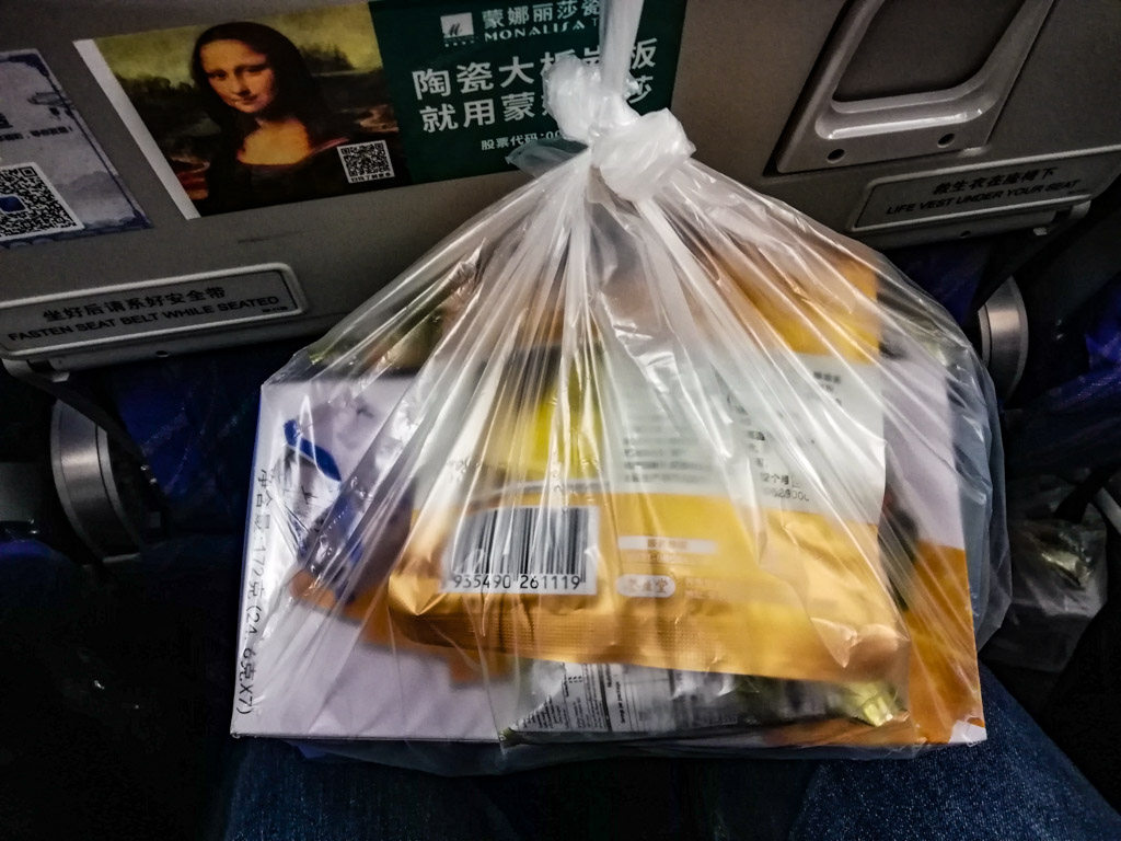 В основном это все пассажиры были китайцами, я заметил только с десяток человек неазиатской внешности. У каждого на его месте лежал уже готовый пакет с едой и напитками.