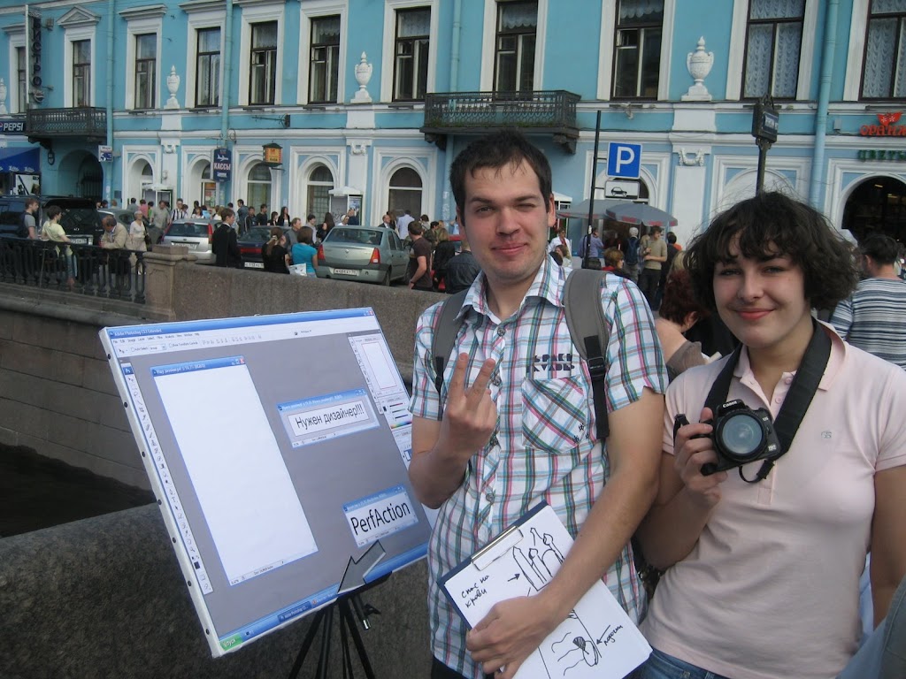 Вчера познакомился с очень интересной парой - впоследствии оказалось что они вовсе не пара правда. Саша и Катя искали по Питеру дизайнера для своей маркетинговой конторы. Для этого они ходили по всему городу с мальбертом на котором стояла фанерка похожая на окошко фотошопа. Перед каждой достопримечательностью, Саша прикреплял к окошку неумелый фломастерный рисунок, а Катя фотографировала это произведение на фоне исходника. Потом ребята повели меня в кафе "Рюмочная" (оно оказалось очень цивильной и тихой кафешкой - не то что наша рюмочная в Нью Йорке), и на крышу арт-спэйса "Лофт".