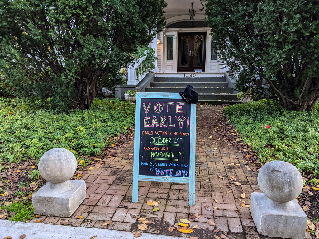 4. А вот как раз вход в один из таких теремков. У нас на районе говорят, что домом владеет довольно известный писатель. У него перед тротуаром стоит вот такая доска, на которой как минимум с начала эпидемии каждый день кто-то писал стишок. А перед выборами тут поставили напоминалку о раннем голосовании. (Я и сам, кстати, частично из-за этой надписи вспомнил что надо проголосовать предварительно.)