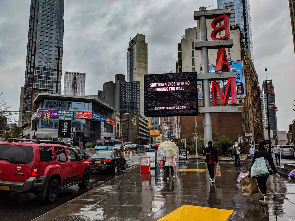 6. За пару дней перед выборами табло в Даунтане Бруклина показывало все заголовки за четыре года администрации Трампа. Всё-таки очень устаёшь от такого темпа новостей: каждый день какие-то выходки. Вот на этой фотографии рассказывают, как Трамп снова всех переиграл в начале 2019.