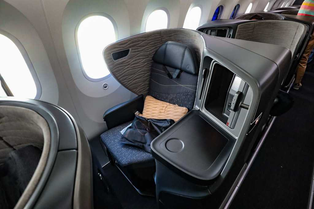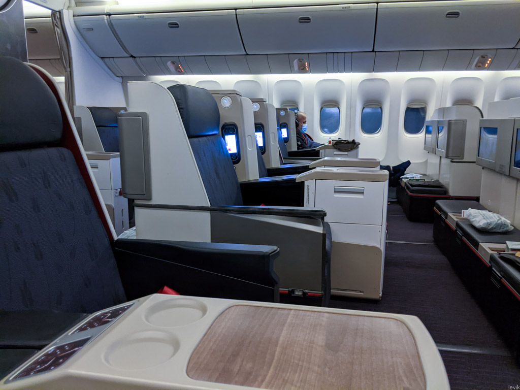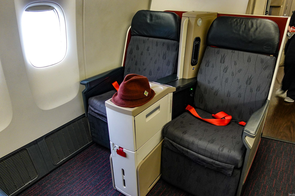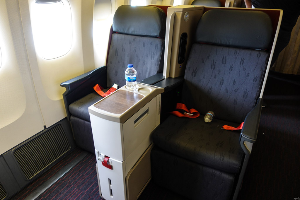 32. Я, когда бронирую билеты, обязательно смотрю на такие вещи - ведь бизнес бизнесу рознь. Например в Дримлайнере у турок салон обустроен рядами по четыре кресла направленных по диагонали, в конфигурации 1-2-1. То есть там гораздо больше личного пространства. И я с удовольствием предвкушал дорогу домой в таком кресле. Там ещё и окна хитро устроены!