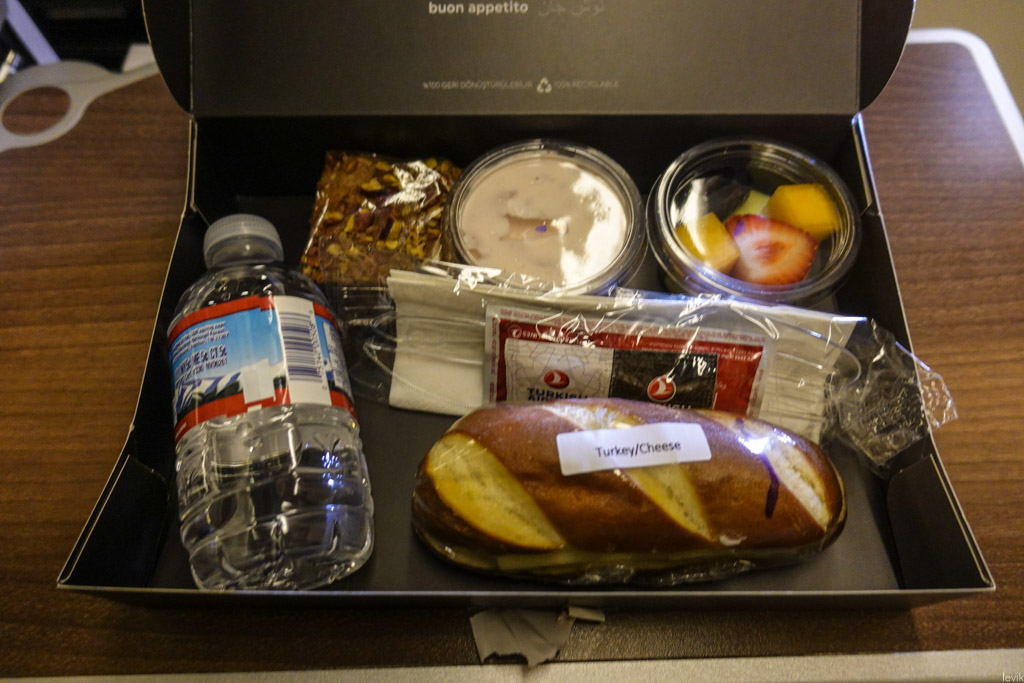 30. Проснулся я незадолго перед посадкой. Мои "хорошие" наушники уже успели забрать, а на столике соседнего кресла меня ждал завтрак - похожая коробочка, только поменьше. Бутерброд с индейкой, йогурт, фрукты и кекс.