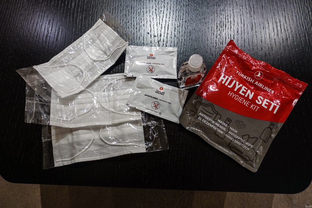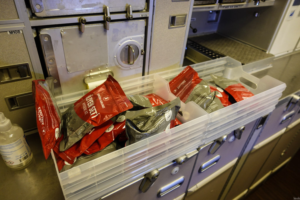 27. После ужина я прогулялся по салону, посмотреть что к чему. Иногда в кухне для пассажиров выкладывают ещё какие-нибудь снеки, но сейчас вместо этого там стоял поднос с теми самыми наборами личной гигиены - наверное на случай, если кому-то не хватает масок.