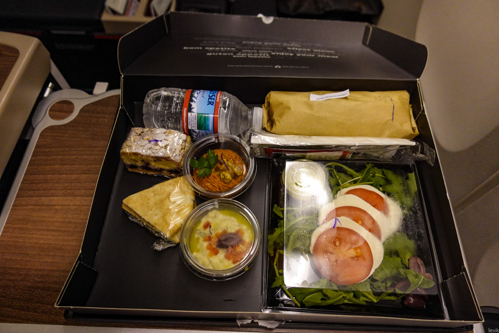 25. Вот, как выглядит в наше время ужин пассажира бизнес-класса. Ролл с курицей, салат, хумус и кекс. Всё это холодное, всё в отдельной упаковке.