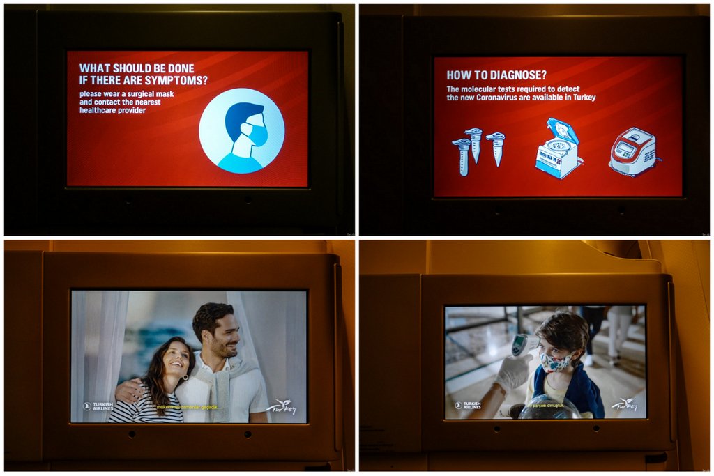 17. Ещё одна особенность пандемии: теперь перед роликом про авиа-безопасность, мелькают информационные экраны на тему того, что делать, если у вас симптомы.