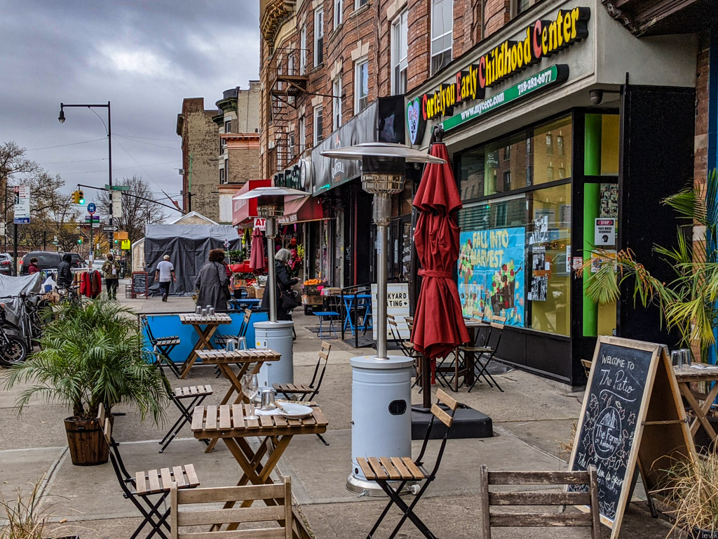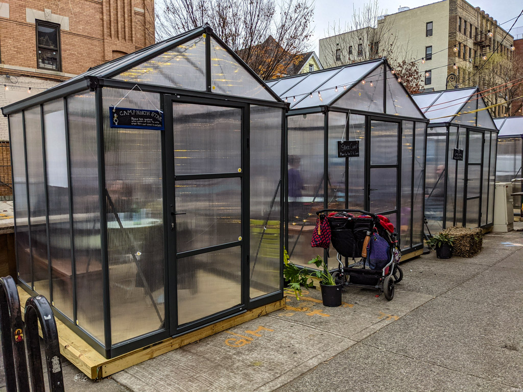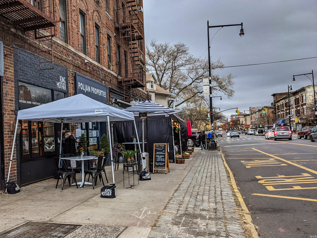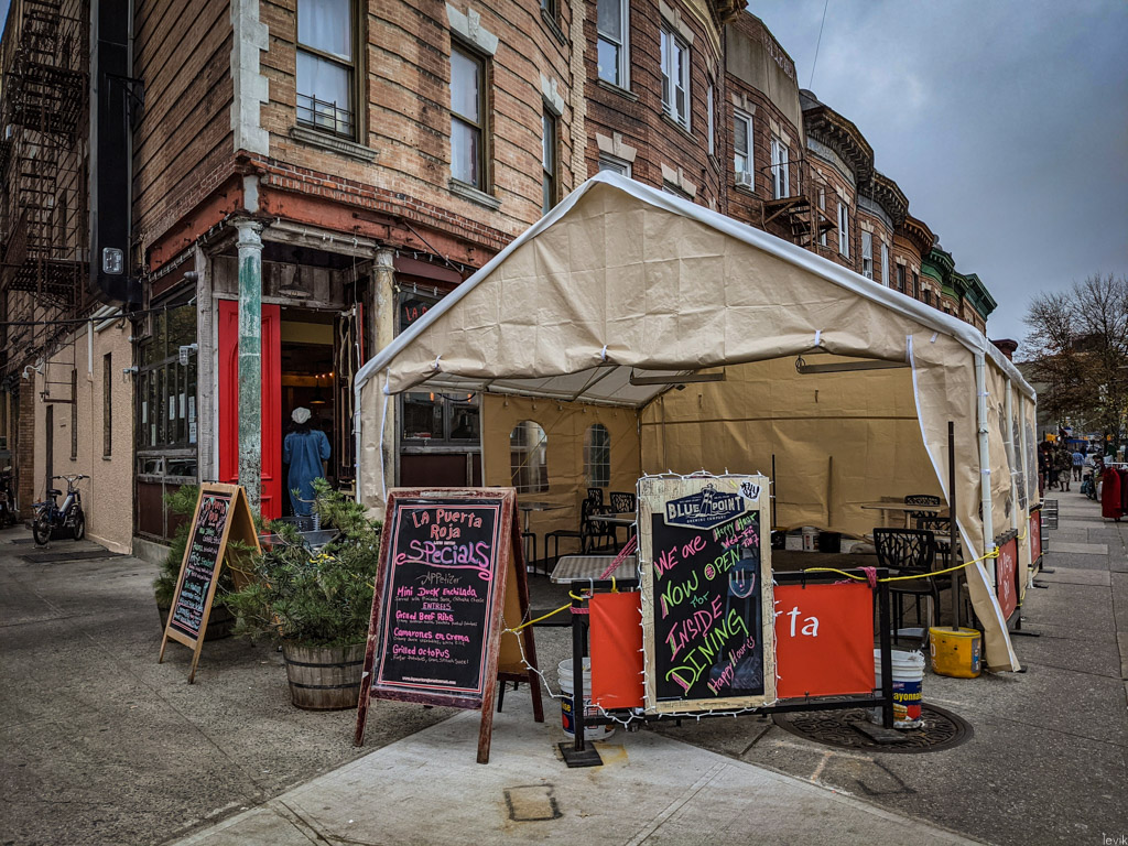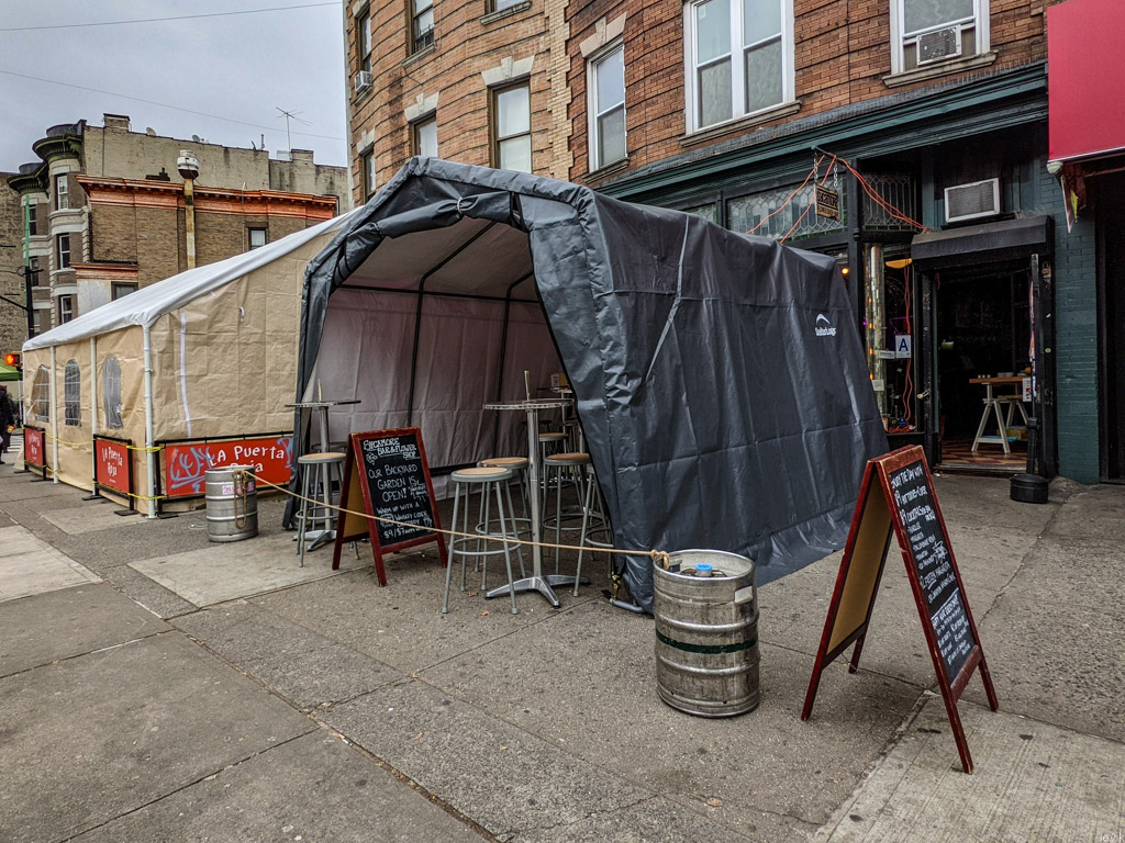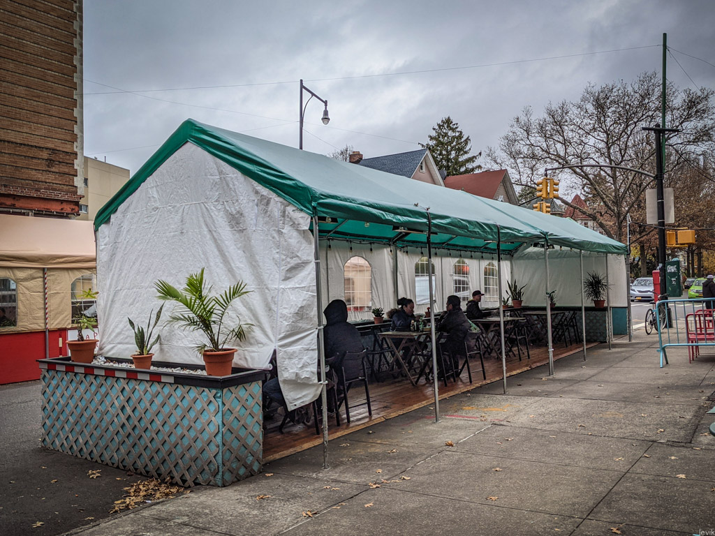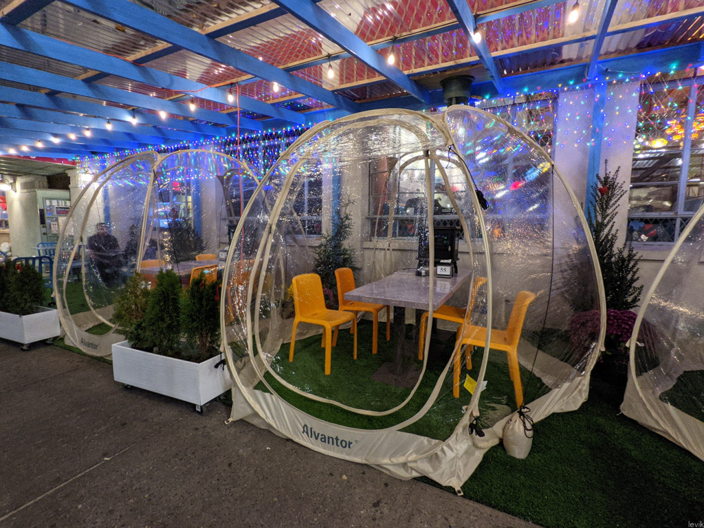 Однако, все понимают, что так долго продолжаться не может. Я прошёлся по своему району, и посмотрел, как владельцы многочисленных местных ресторанов готовятся "зимовать" в формате столиков "на улице". Обычно, такие не пользуются большой популярностью у нас в городе. Во первых, из-за климата: летом в Нью Йорке для этого слишком жарко, зимой - слишком холодно. Получается, что комфортно посидеть на улице, наслаждаясь ужином можно пару недель осенью, и ещё пару недель весной.