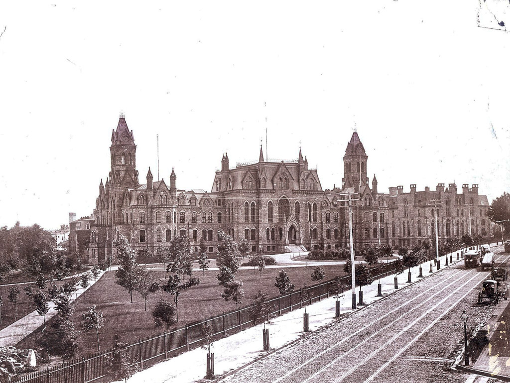 14. Но это ещё не всё. Оказывается, что зелёный камень был настолько слаб, что изначальные неоготические черты здания пришлось сильно упростить, во избежание катастрофического обвала. Посмотрите ещё раз на старую фотографию Колледж-Холла:
