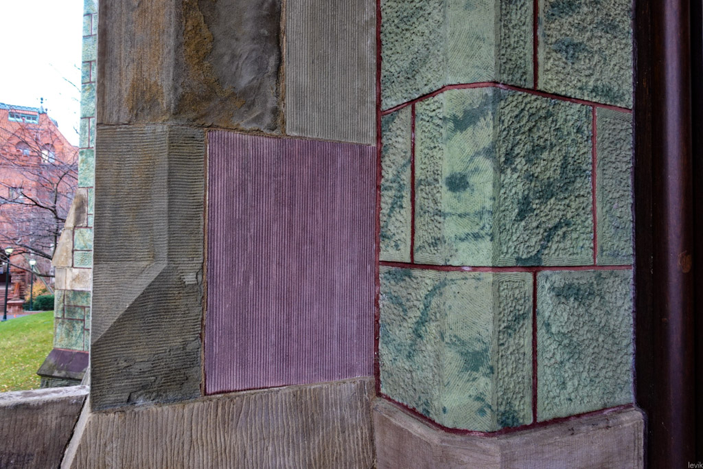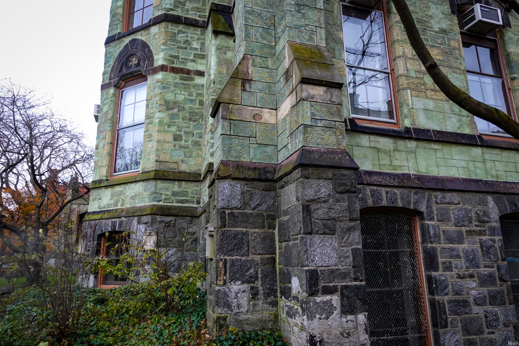 13. И тут оказалось, что красивый зеленоватый серпентинит просто не очень долговечен. С годами камень начал крошиться и трескаться, фасад требовал постоянного ухода и реставрации. И уже через несколько десятилетий после завершения, Колледж-Холл надо было капитально ремонтировать, укрепляя хрупкий змеевик более долговечным и прочным цементом.