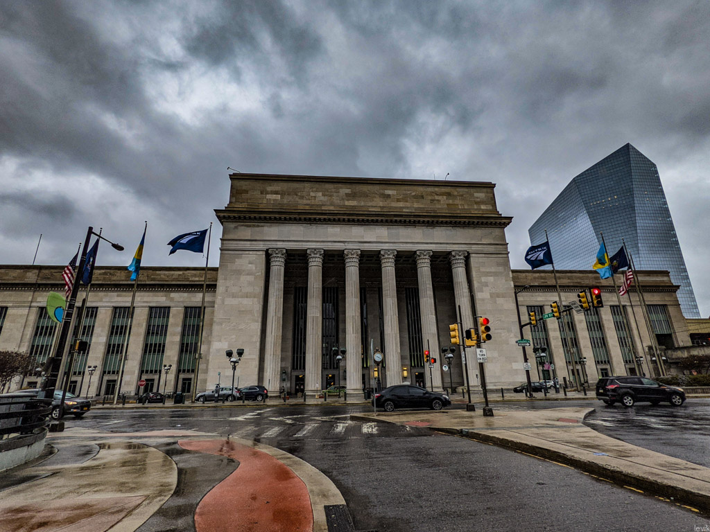 Короче, пошли посмотрим на серую и зябкую Филадельфию: 1. Мой визит в город начался отсюда: с монументального здания вокзала на 30й стрит. Его открыли в 1933, когда пассажирские железные дороги были главным способом передвижения по Америке. Из Нью Йорка в Филадельфию можно приехать на машине или автобусом, но я не упустил возможности прокатиться на поезде. Дорога между городами занимает где-то час - полтора, в зависимости от того, каким поездом ехать. Самый быстрый (но и самый дорогой) вариант - Асела - является единственным скоростным поездом в США.