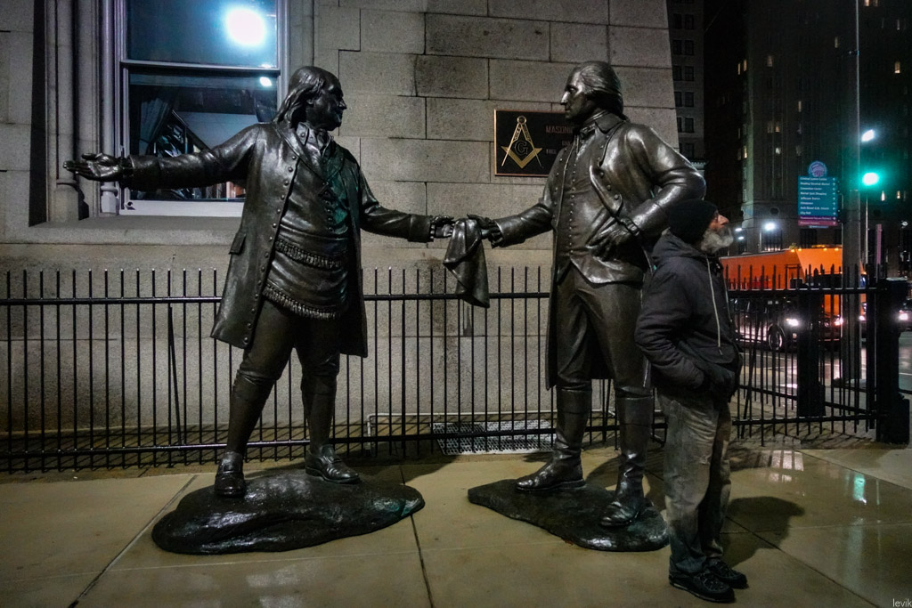 21. Рядом с ратушей стоит памятник масонам Франклину и Вашингтону. Рядом один из местных жителей.