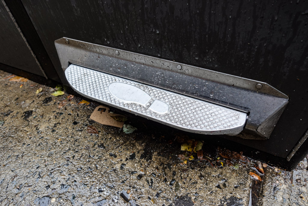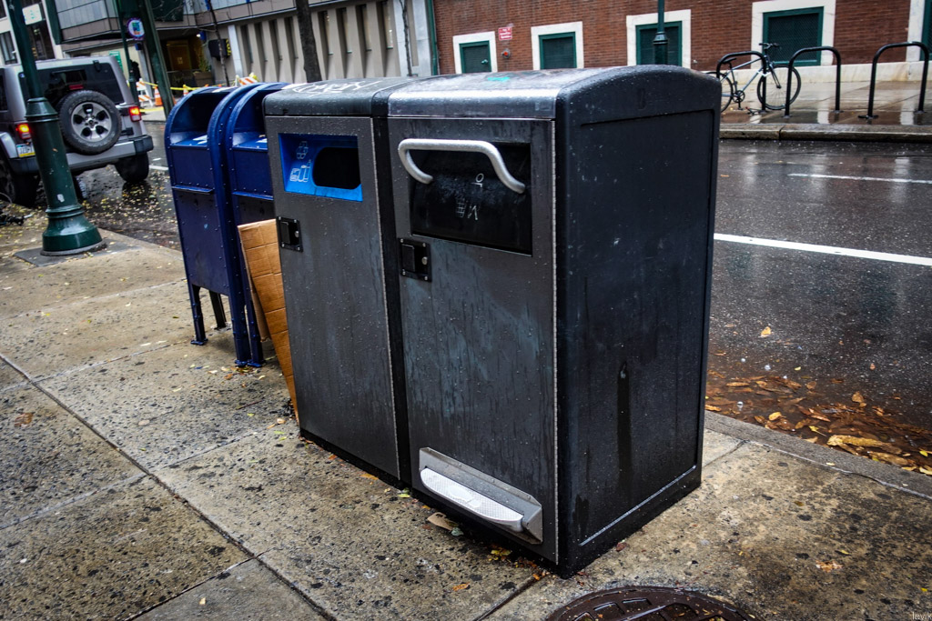 16. Уличные урны в центре города. Кажется, они внутри себя спрессовывают мусор. У нас в НЙ тоже такие есть, и мне всегда немного противно тянуть за эту рукоятку, чтоб открыть бак. Особенно в эпоху ковида! Но тут в Филадельфии эти баки прокачали так, что рукой открывать и необязательно!