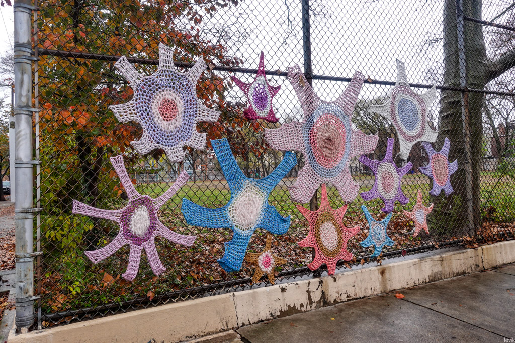 14. В последние годы всё чаще встречаю вот такой вязанный стрит-арт на сетчатых заборах в разных городах. По-моему это отличная тенденция.