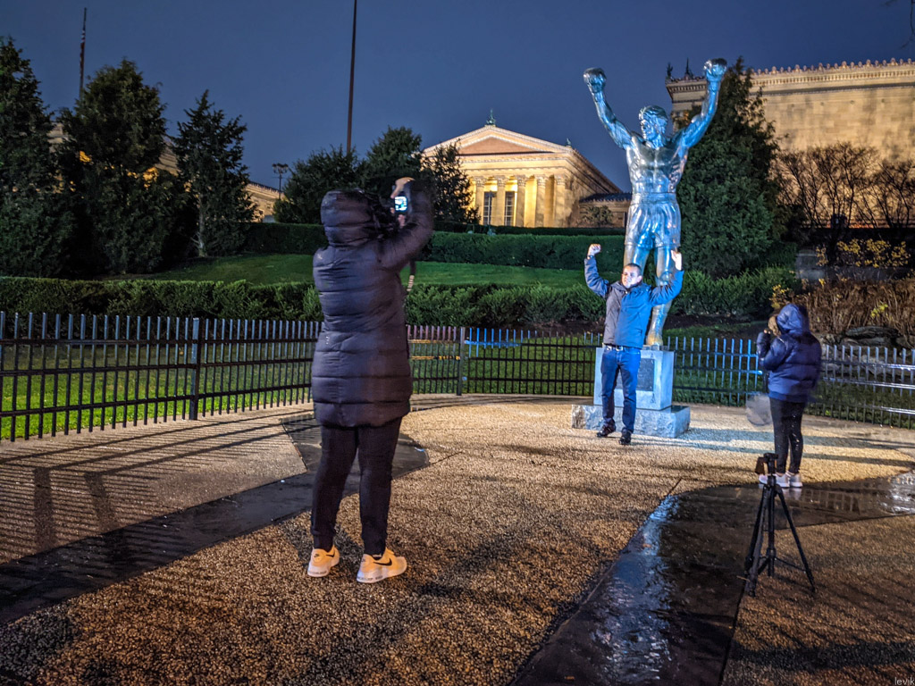31. Тем более, что самый знаменитый экспонат, ассоциируемый с этим музеем, стоит на улице. Это памятник тому самому боксёру Рокки, рядом с которым все фотографируются. Вот тут как раз молодой человек согласился продемонстрировать читателям моего блога, как правильно надо фотографироваться на фоне Рокки:
