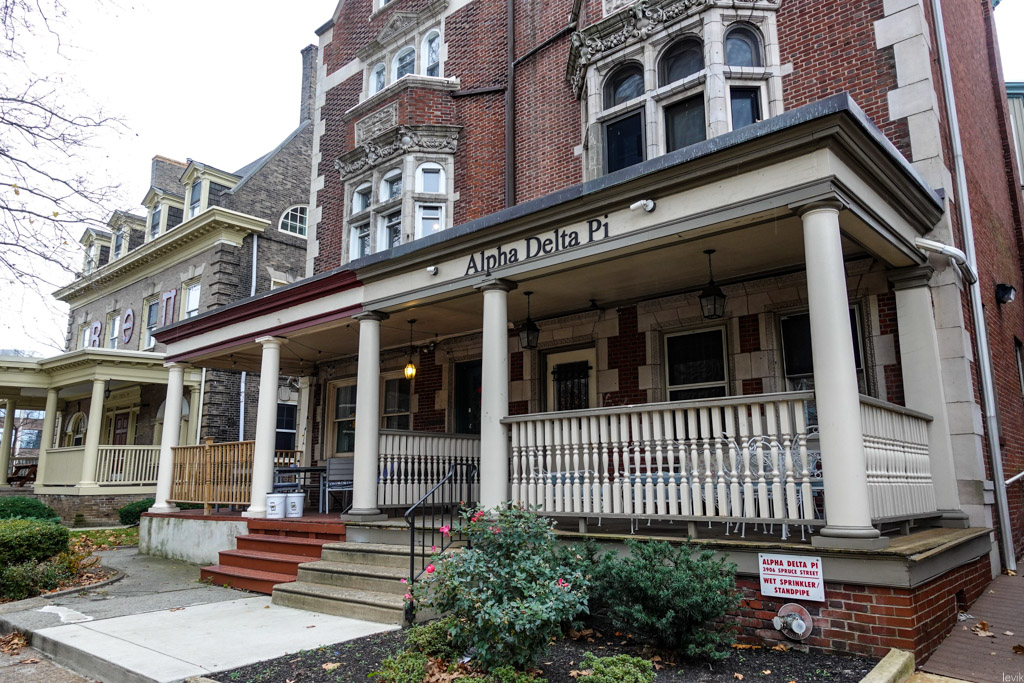 5. Пока мы гуляли, начали замечать, что на многих таких домиках висят названия греческих букв. Как правило - по три буквы выписанные латиницей. Это названия студенческих образований - fraternities and sororities (буквально "братства" и "сестричества"). Это такая странная фишка американских ВУЗов, возможно вы видели про такие объединения в кино. Студенты объединяются в организации, проводят различные вступительные ритуалы, снимают в складчину дом (где проводятся вечеринки), и т.д. Насколько я понимаю, в России такого не бывает, про другие страны не знаю.