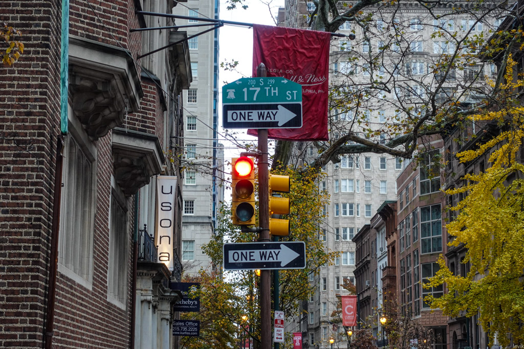 15. Немного об уличной среде. На указателях с названиями улиц в старой части Филадельфии нарисован Колокол Свободы. Звон этого колокола созвал жителей города на новости о подписании Декларации Независимости, и сегодня колокол хранится в музее в Филадельфии, являясь одной из его главных достопримечательностей. Сперва я подумал, что символ колокола на табличках и указывает, в какую сторону нужно идти, чтоб увидеть его. Но, оказалось, это просто такой штришок дизайна, и показывают они все в разные стороны.