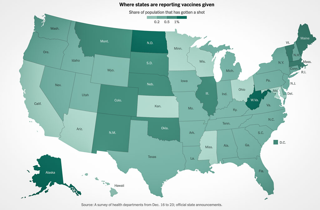 С момента одобрения первой вакцины от Covid-19 (оказалось, американское правительство за неё переплатило) прошло где-то полторы недели. Больше 10 миллионов доз уже доставлены штатам. По информации на вчера, где-то 2,100,000 граждан США получили первую дозу вакцины (она даётся в два захода). Это меньше одного процента населения страны, но всё же явный прогресс.При этом прошли новости, что власти в Нью Йорке расследуют случай, когда частная медицинская компания получила вакцину якобы для своих сотрудников, и потом перенаправила её обычным людям. Напомню, что согласно правилам, выработанным властями, первыми прививки получают врачи и прочие медицинские работники. Если окажется, что эти правила были нарушены, то виновные могут понести серьёзные наказания.
