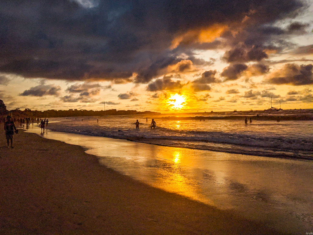 1. Ужинали мы на закате, прямо на пляже. Солнце садилось в Тихий Океан, окрашивая небо и облака в оранжевый огненный цвет. Вообще, мало где я видел столь выразительно-яркие закаты, как здесь, в Коста-Рике.