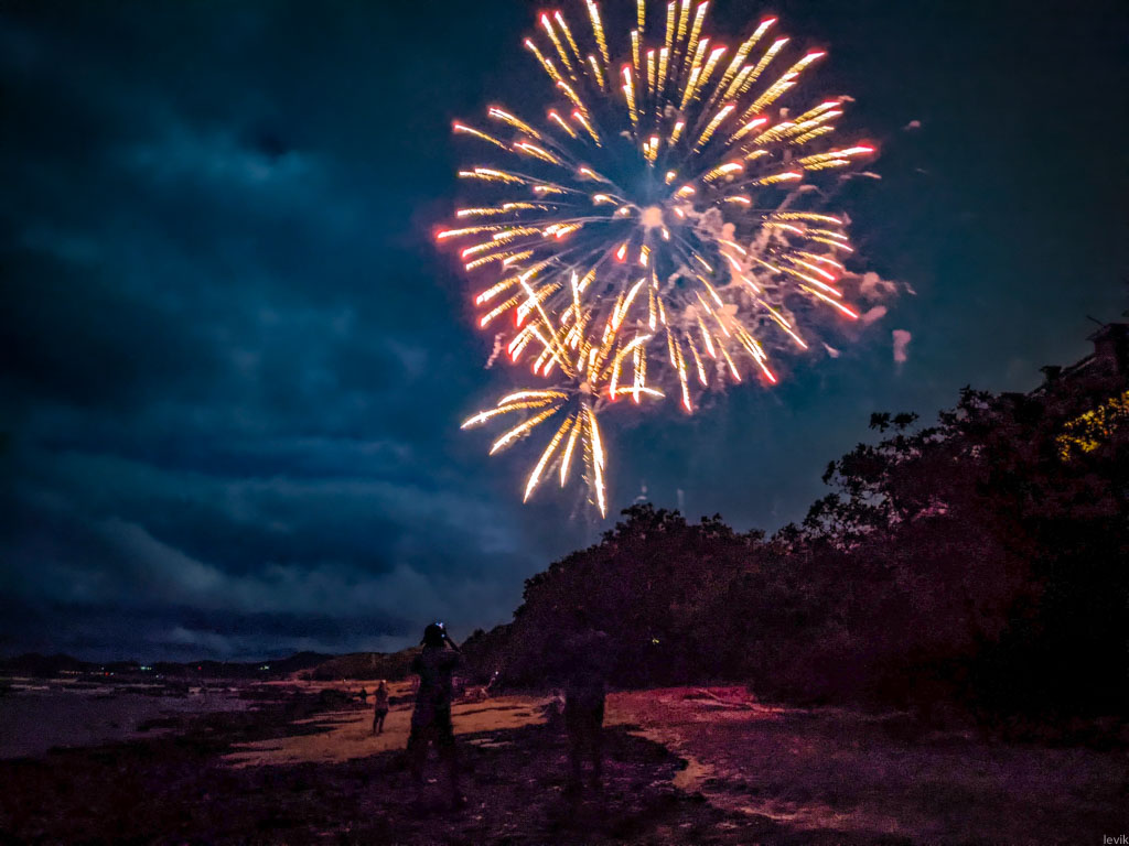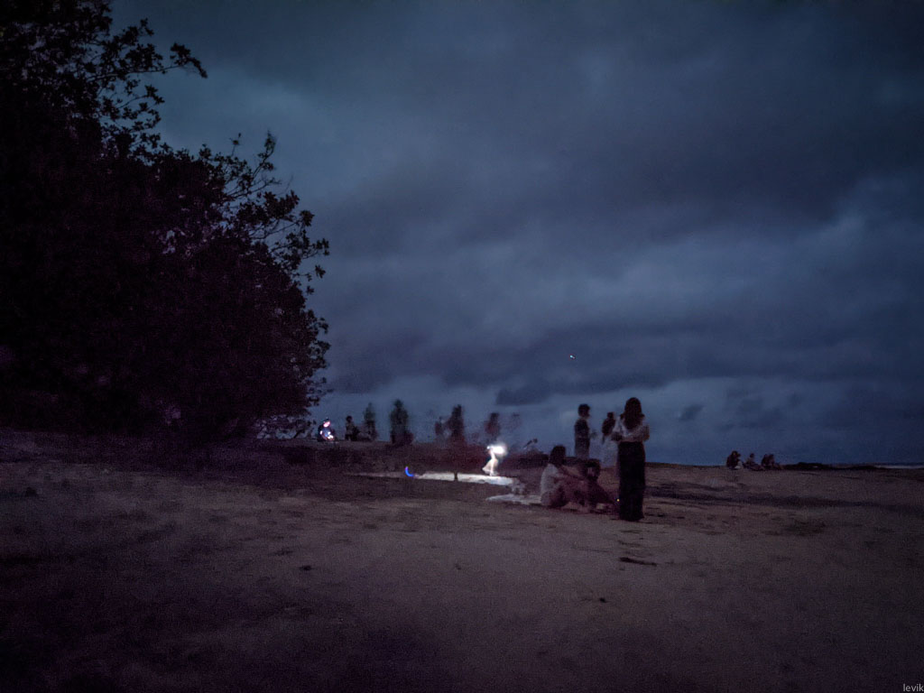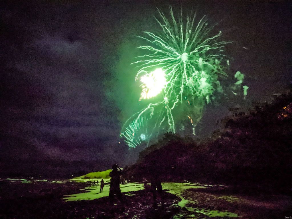 8. А потом, ровно в полночь, когда мы открыли шампанское (специально из НЙ привезли бутылку!) над пляжем где-то в ста метрах от нас разразились раскаты салюта. Каждый очередной залп освещал окрестности на долю секунды.