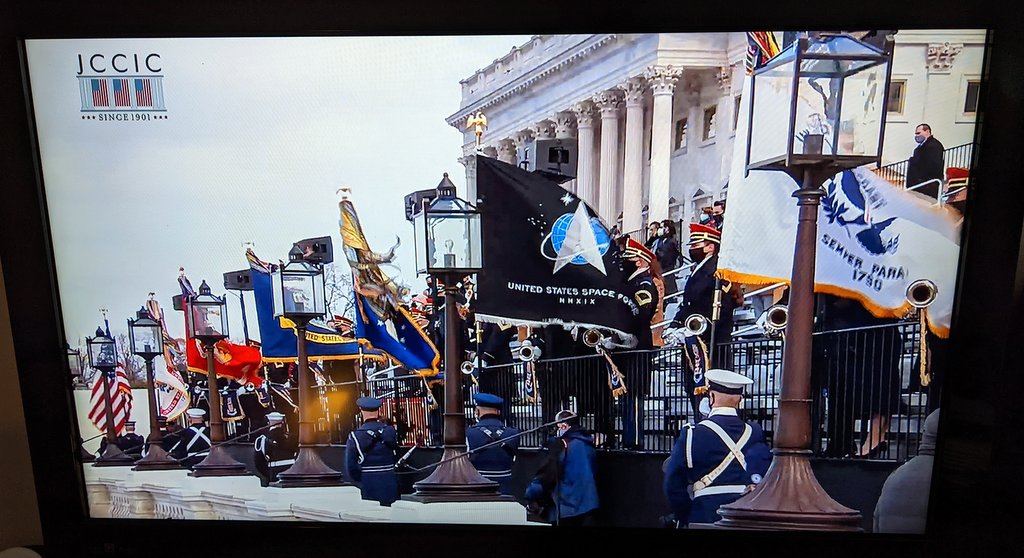 Вынесли знамёна различных военных сил - армии, флота, ВВС, и т.д. Впервые в их числе флаг Космических Войск, которые учредил Трамп. (Их герб - явная калька с сериала Star Trek.)