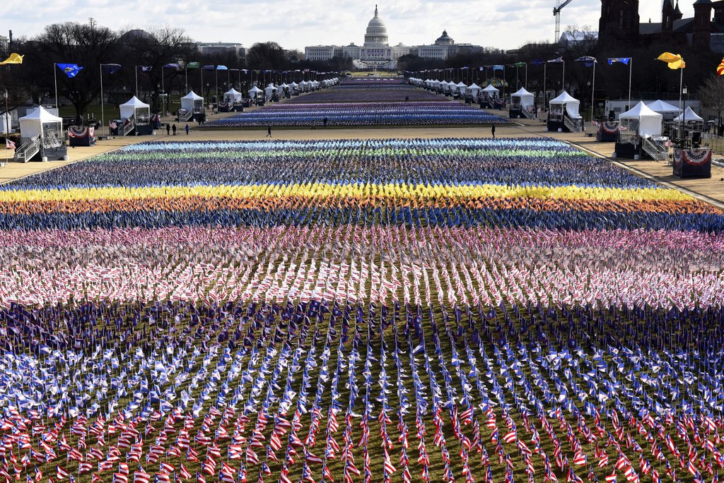 Вместо зрителей, пространство перед Капитолием было заполнено рядами флагов. Здесь были десятки тысяч флагов - не только США, но и различных штатов, округа Колумбия, где находится Вашингтон, и территорий вроде Пуэрто Рико.