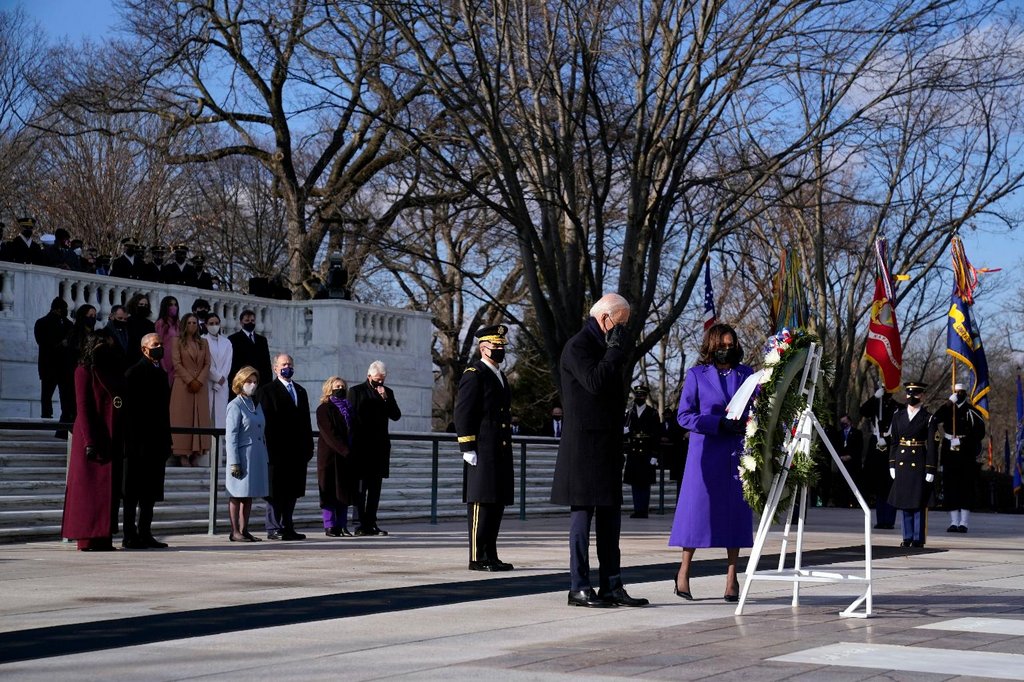 После церемонии, Байден и Харрис с семьями и в сопровождении бывших президентов, отправились на Арлингтонское кладбище, где возложили венок на могилу неизвестного солдата.